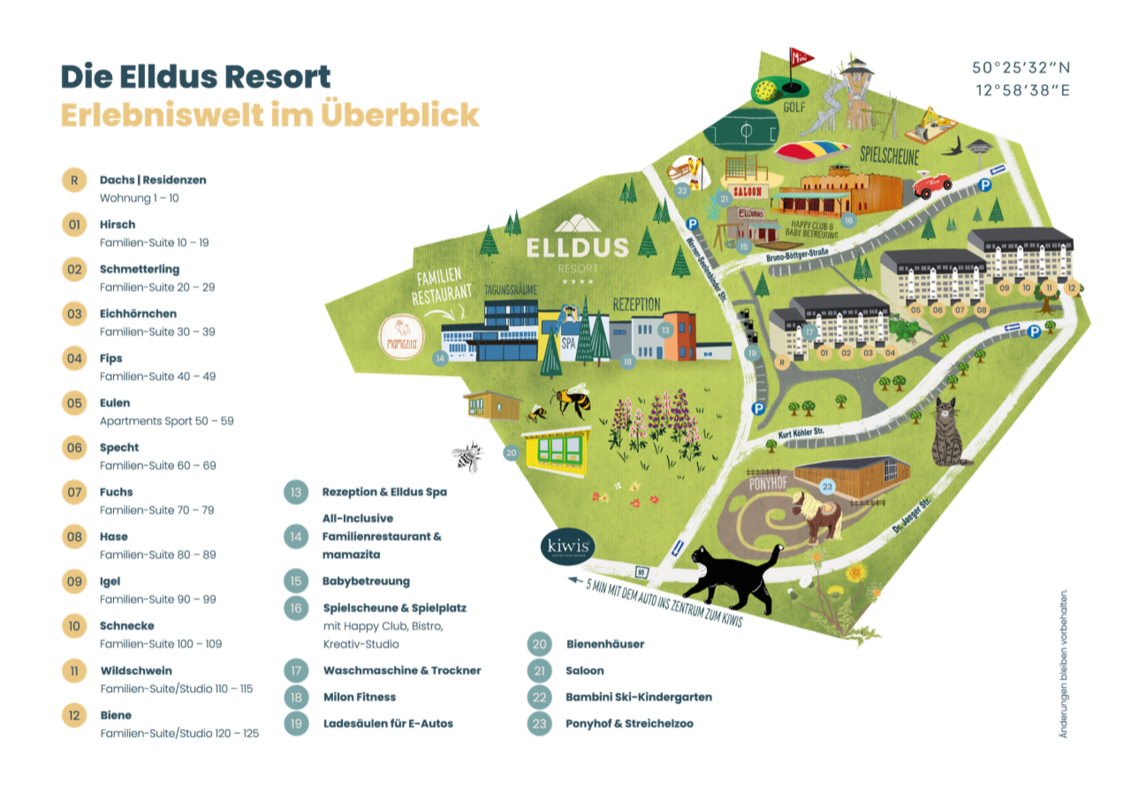 und Familien-Suiten befinden (5 Etagen, kein Fahrstuhl vorhanden, außer bei den Elldus Residenzen | nicht barrierefrei), - dem riesigen Spielscheune-Areal mit Indoor- & Outdoor-Spielplatz, Kunstrasenfußballplatz, kleinem Rodelhang und Ski-Kindergarten, Saloon mit Grill, Happy Club, Keramikwerkstatt und Family-Store direkt hinter den Apartments,